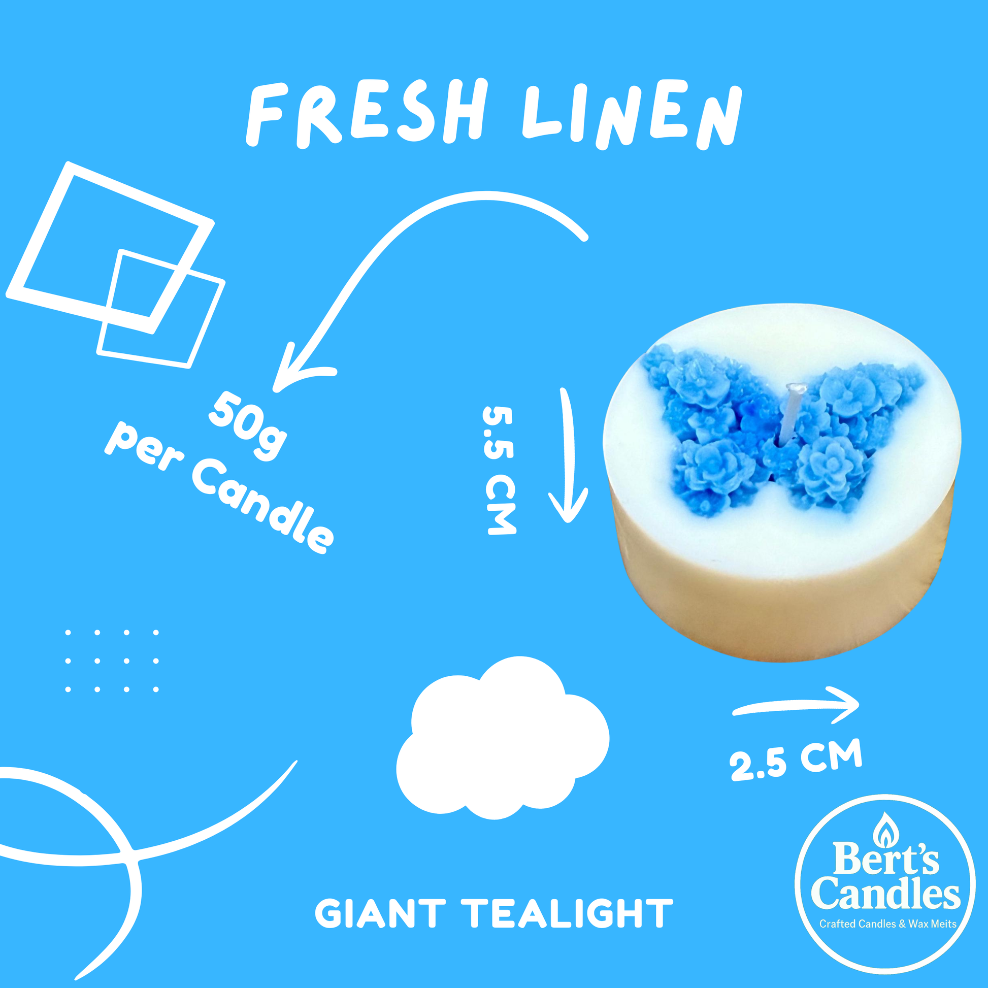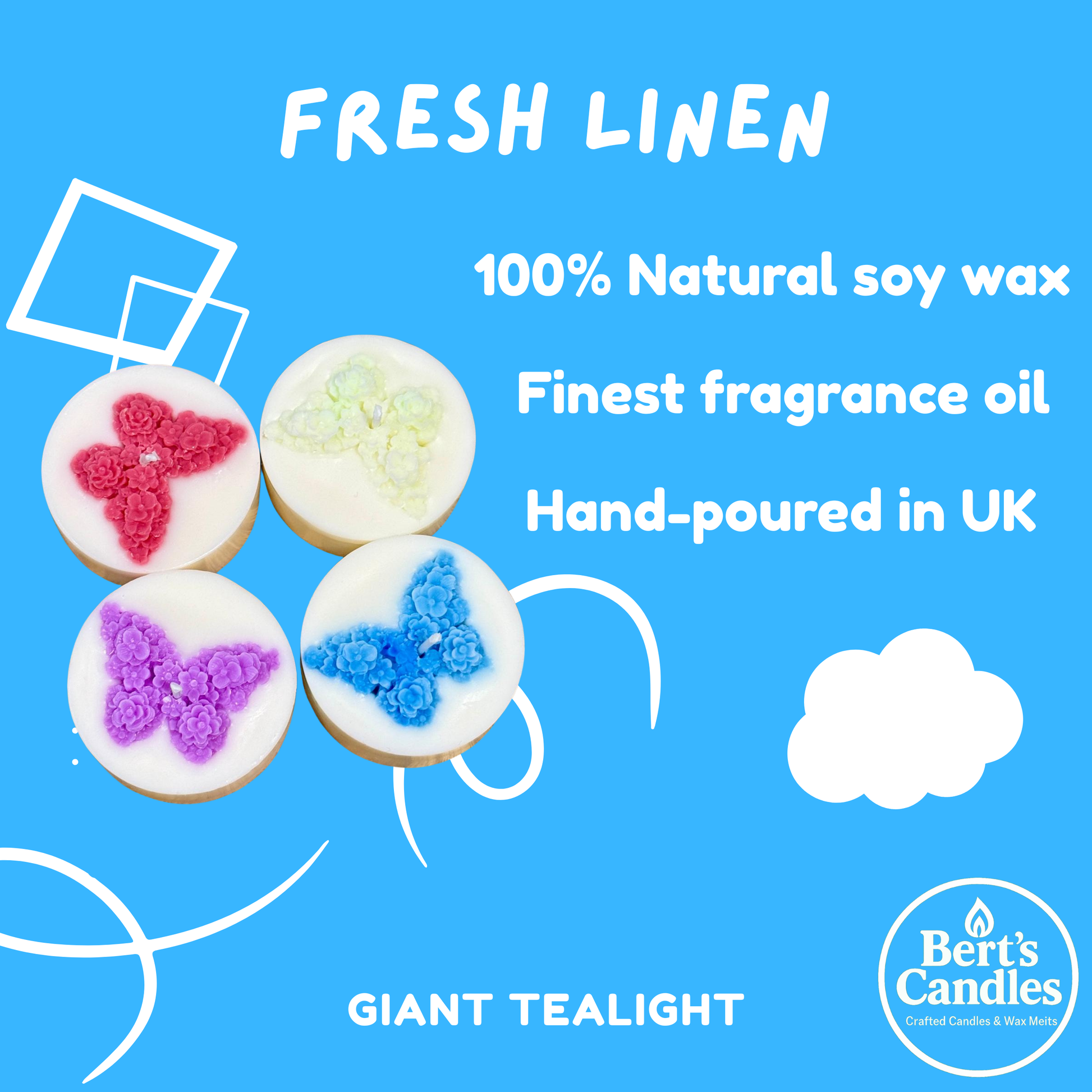 Experience a longer-lasting burst of fresh, uplifting fragrance with Bert’s Fresh Linen Giant Tea Lights. Each tea light is four times larger than standard, providing extended burn time and an improved scent throw that fills your space with the clean, comforting aroma of freshly washed linen.